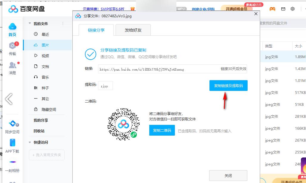 3、当创建链接完成之后,点击【复制链接及提取码】,然后将自己复制的链接分享给别人就好了。