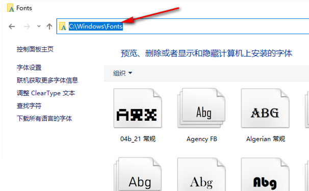 2、进入文档页面之后,我们在该页面中点击路径框内的文件夹图标,然后全选路径,再将路径替换为“C:WindowsFonts”并点击回车键,进入字体文件夹。