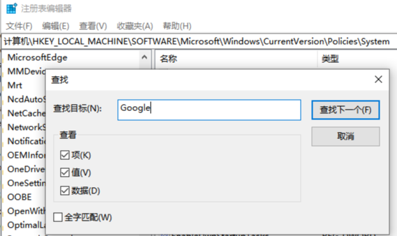 3、点击查找按钮,在出现的查找窗口中输入“Google”然后点击后方“查找下一个”按钮。