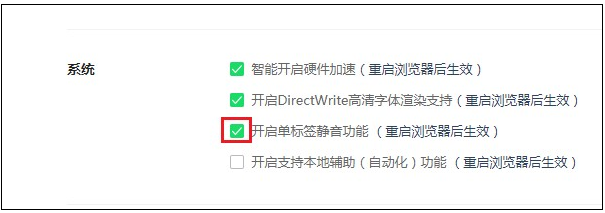 4、进入实验室页面后,在页面右侧找到“系统”这一栏,将右侧的“开启单标签静音功能”勾选起来,最后重新启动360安全浏览器就可以了。