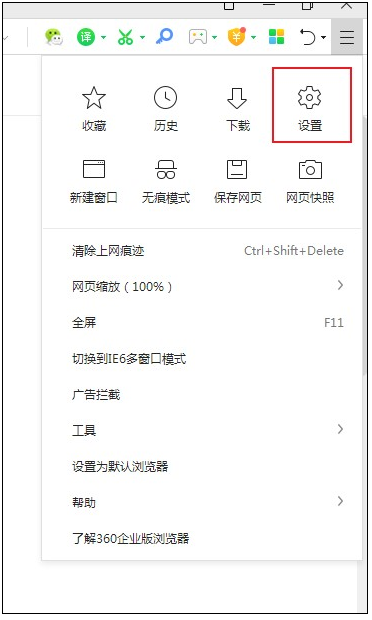 2、这时下方会弹出360安全浏览器的菜单窗口,在窗口中点击“设置”打开设置页面。