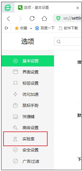 3、进入360安全浏览器的设置页面后,在页面左侧点击切换到“实验室”页面。