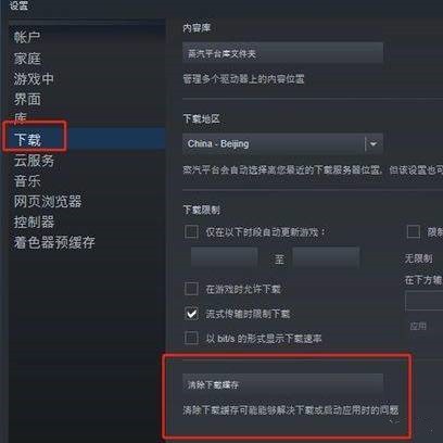 六、重新登陆STEAM客户端,在设置中找到下载栏,并清除下载缓存尝试。
