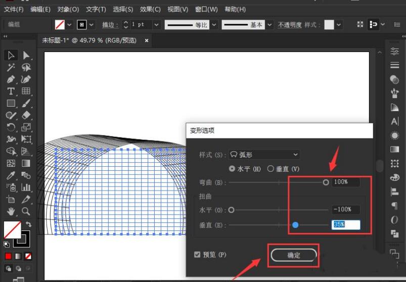 3、把弯曲调整为【100%】,水平为【-100%】,垂直为【35%】,点击【确定】。
