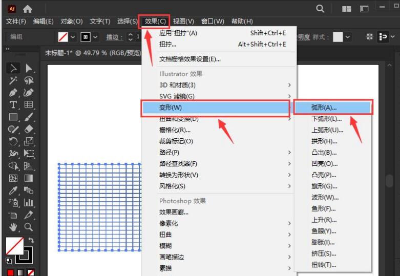 2、选中矩形网格,点击【效果】-【变形】选择【弧形】。