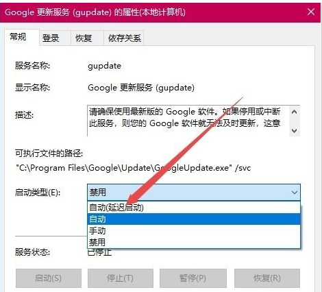 6、这时会打开Google更新服务窗口,在这里点击“启动类型”下拉菜单,在弹出菜单中选择“自动”菜单项。