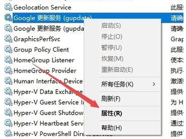 5、这时会打开Windows10的服务窗口,在服务列表中找到Google更新服务一项,然后右键点击该服务项,在弹出菜单中选择“属性”菜单项。(一共有两个Google服务项,可随意先选择其中一个)。