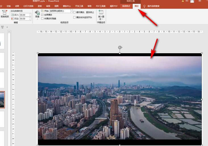 3、插入之后可以看到上方自动出现了“视频工具”,我们可以点击切换到“播放”栏中,对视频进行设置。