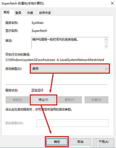 3、双击superfetch服务,打开把启动类型设置为禁用。点击应用 - 停止 - 确定 。