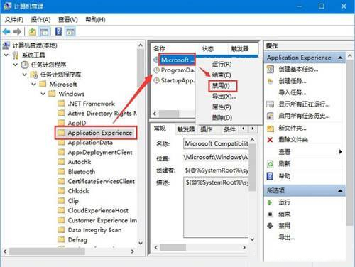 5、展开:计算机管理\系统工具\任务计划程序\任务计划程序库\Microsoft\Windows\Application Experience,找到 Microsoft Compatibility Appraiser选项,将其禁用。之后磁盘就不会动不动就占用100%了。