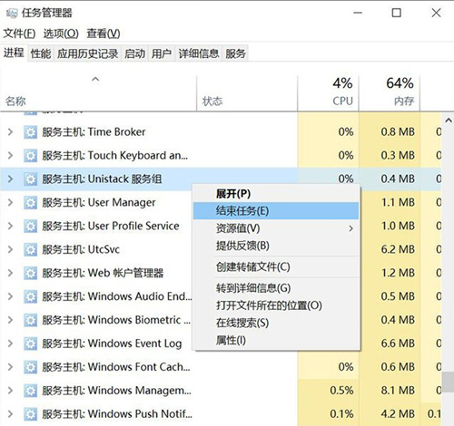 1、我们可以使用键盘上的快捷键 “Ctrl+Alt+Del”来打开任务管理器,然后我们切换到进程的选项卡中,大家找到“服务主机:unistack服务组名字的进程,右键点击将它结束任务,假如关闭这个过程没用,会自动重启,提议反复关掉直至不再发生,一般关掉三到四次,就不会再出现了。