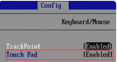 在启动系统的过程中(按下开机键之后持续按F1进入BLOS程序中,在Config菜单选项中找到Keyboard/Mouse选项,将Touch Pad设置为Disabled即可。如下图: