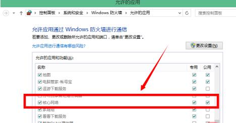 2、在防火墙设置下找到“允许应用通过windows防火墙设置”,这个选项,并在允许的应用里面讲“核心网络”更改为打开状态(前面打上对号)。