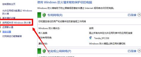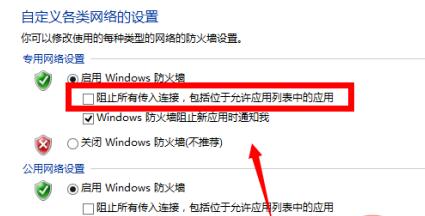 3、找到防火墙设置下的“检查防火墙状态”,并找到“启用或关闭windows防火墙”,并将“阻止所有传入连接,包括位于允许应用列表中的应用”前面的对号去掉。