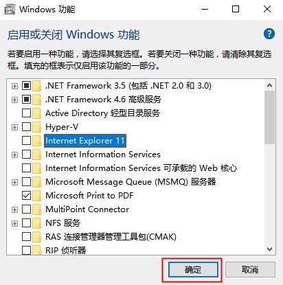 6、在勾选取消后再点击【windows功能】界面中的【确定】。