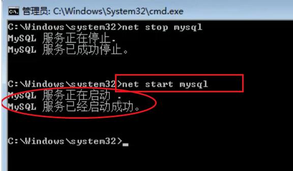 3、要想启动MySQL服务,则可以在cmd窗口输入net start mysql。显示下图椭圆框中的内容,则为启动成功。
