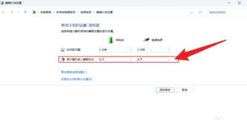 3、打开的界面中,把睡眠状态设置成从不,然后保存修改。