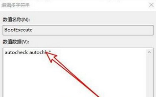 2、然后在右侧窗口中找到“BootExecute”键值项并将其数值清空,然后确定,重新启动电脑即可。