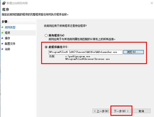 5、程序界面中选择【此程序路径】,再点击下方的【浏览】将需要进程的安装路径选择好,然后点击【下一步】。
