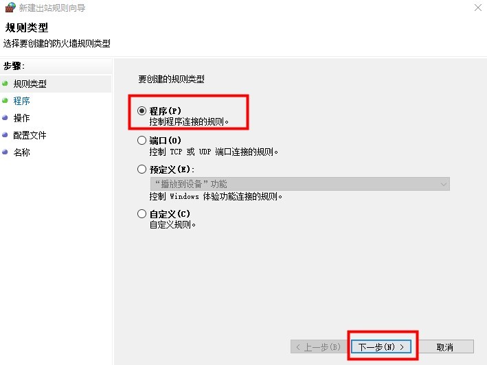 4、然后在【新建出站规则向导】界面中选择【程序】,点击【下一步】。