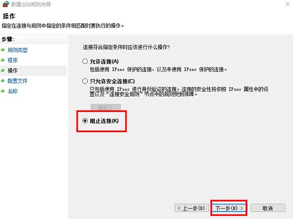 6、然后在操作界面中设置【阻止连接】,再点击【下一步】。