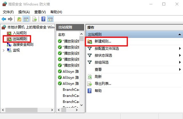 3、在【高级安全Windows Defender防火墙】界面中点击左侧的【出站规则】,再点击点击右侧的【新建规则】。