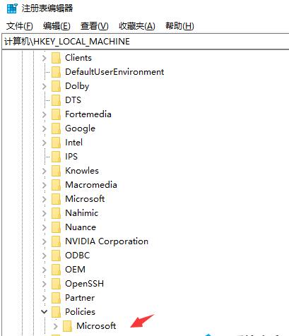 3、然后在打开的注册表编辑器窗口中定位到”HKEY_LOCAL_MACHINE\SOFTWARE\Policies\Microsoft“注册表项。
