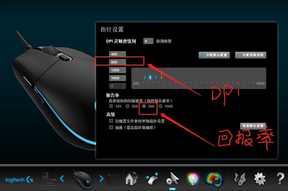 DPI,指的是鼠标在桌面上移动1英寸的距离的同时,鼠标光标能够在屏幕上移动多少“像素”。DPI不是越快越好,也不是越慢越好,而且每个人的适应能力不同,要找适合自己的,方法就是慢慢试。