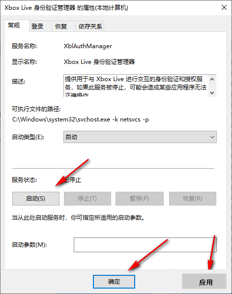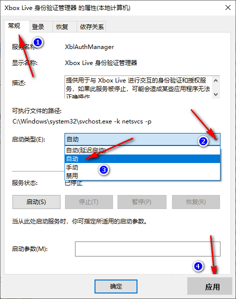 3、将Xboxlive身份验证管理器进行鼠标双击进入,进入之后,在【常规】选项卡下,将【启动类型】设置为【自动】,然后再点击应用按钮。