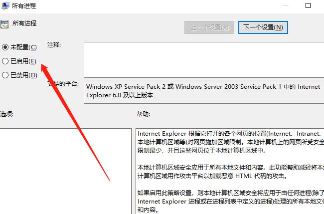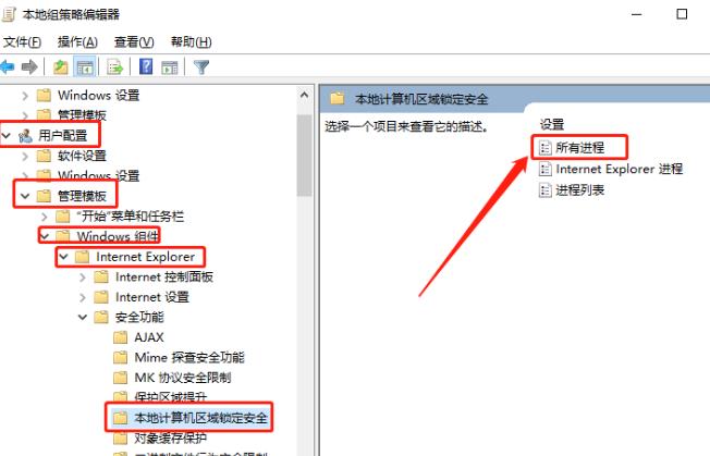 2、接着,在打开的界面中,依次点击展开“用户配置-管理模板-Windows组件-Internet Explorer-安全功能-本地计算机区域锁定安全”,并双击打开其中的“所有进程”。