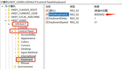 3、在注册表编辑器中,依次展开“HKEY_USERS > .DEFAULT > Control Panel > Keyboard”,点击Keyboard之后在右侧窗口中找到InitialKeyboardIndicators项目,双击进入。