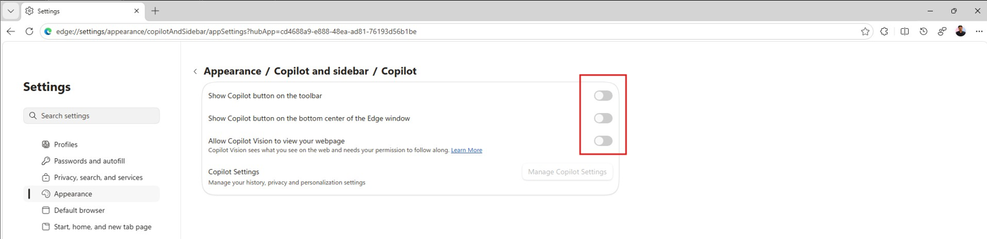 8. 关闭右侧页面的全部开关以禁用 Copilot 模式。