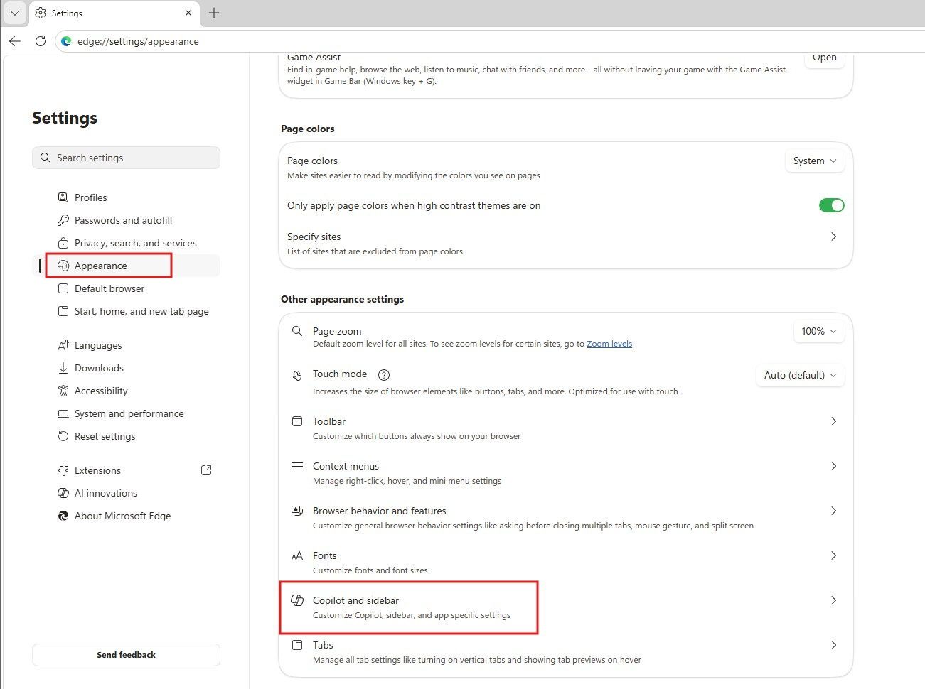 2. 在左侧菜单中选择“外观”,向下滚动页面,选择“Copilot 侧边栏”。