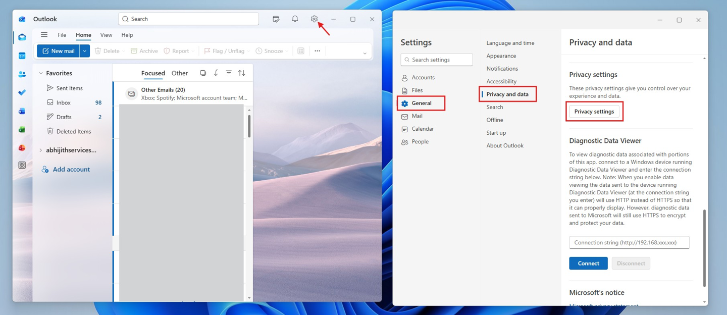 普通 Outlook 应用没有侵入式的 AI 功能,但它会在后台利用 AI 分析邮件内容。要关闭这项功能,需要在 Outlook 设置中找到“常规 - 隐私和数据 - 隐私设置”,将“启用分析您内容的功能”关闭。