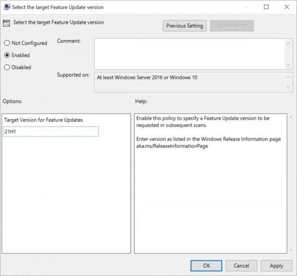 6、重启PC如果你已经升级到Windows1021H2功能更新,那么组策略和注册表的修改内容稍有不同。管理员可以在更新的策略中指定一个Windows版本和一个功能更新版本。使用它,你可以选择Windows10作为版本,然后选择操作系统的功能更新版本,例如21H2。