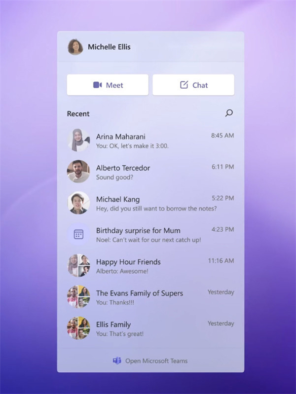 Microsoft Teams 支持 Windows、Android、iOS 三组平台,即便对方没有下载 Teams,也可以通过短信与其双向沟通。而任务栏则直接集成 Microsoft Teams 按钮(类似于之前的 Skype MeetNow),以方便用户更快速地与好友联系。