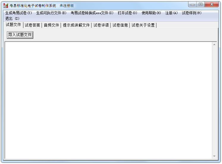 试卷文件可以是*.txt、*.htm、*.rtf格式,然后导入试卷文件,试卷必须导入,不能为空。如果试卷文件还有其它相关链接文件,如网页里含有图片等,则把图片等放到主试卷文件同名的.files文件夹里;如试卷文件为index.htm文件,则把链接文件放到index.files文件夹里。
