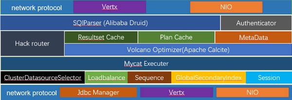 支持前端作为mysq通用代理,后端JDBC方式支持Oracle、DB2、SQL Server、mongodb、巨杉。