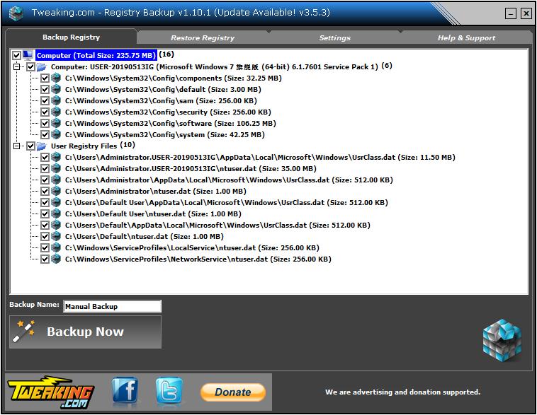 Registry Backup是一款免费的注册表备份软件,该软件小巧,而且能够快速地备份电脑里面的注册表,当用户误删注册表信息的时候,就可以通过该备份软件找到删掉的注册表,再把注册表进行恢复即可。
