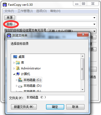 第四步,同样单击[目标按钮,弹出一个窗口选择要拷贝到的目标地址,然后单击[确定]按钮。