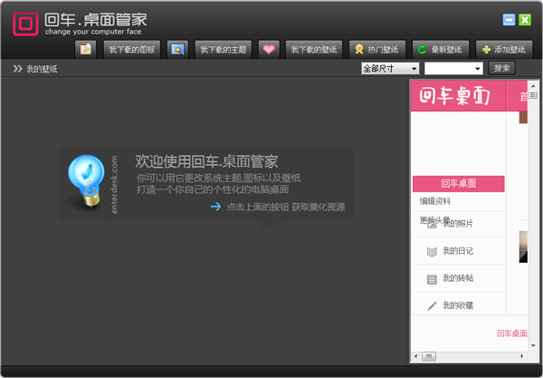 回车桌面管家可以快捷,方便的设置桌面壁纸,除提供平铺,拉伸,居中的设置壁纸模式,更首创自动设置壁纸功能,任何照片图片都可以设置为最合适的桌面壁纸,可设置每天电脑启动,随机自动更换你选择的壁纸,海量的桌面壁纸库供你选择。