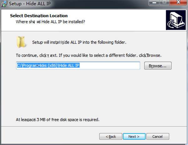 3、之后选择软件安装位置路径C:Program Files (x86)Hide ALL IP,并点击next;