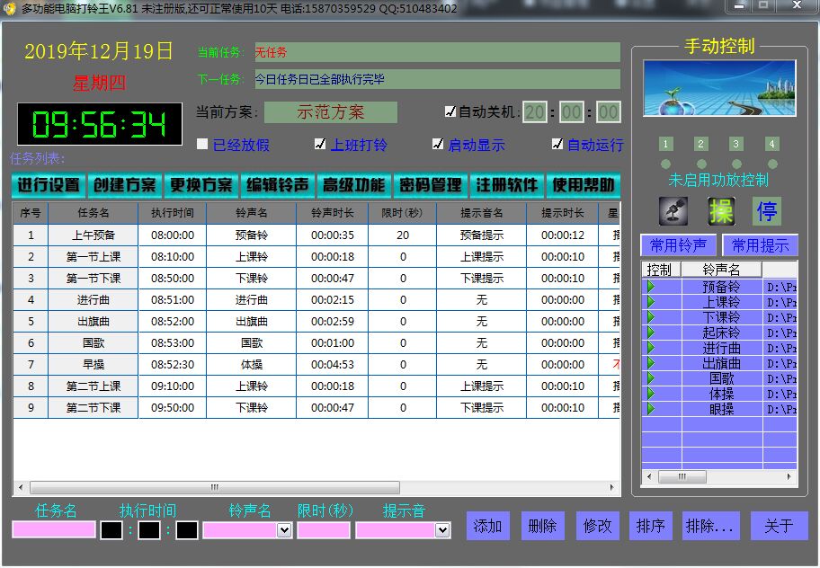 本软件操作界面直观、步骤清晰,可以创建任意多套方案,并可以自动切换,智能语音提示功能使校园充满人性色彩。通过本软件即可以控制电脑电源,只需一个简单廉价的设备便可以用本软件自动控制功放机的电源和实现分区广播。主要功能:自动打铃、自动播放各种音乐(如欣赏音乐、体操、出旗曲和国歌等)、自动播放网络广播、自动获取天气预报、自动关机、自动开机、自动对时、自动切换打铃方案、自动控制功放机电源。