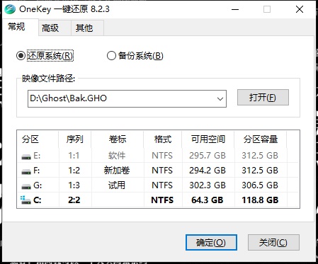 2、程序默认对当前系统所在分区进行备份、还原操作,可选择其他分区;