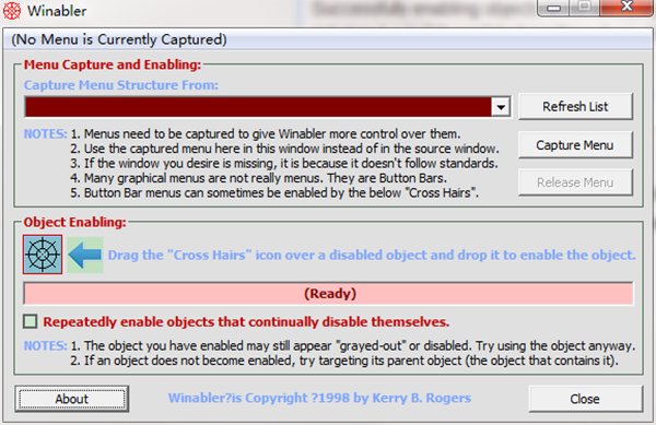 如果您使用的应用程序具有无法访问的菜单,那么如果Winabler支持该应用程序,则可以激活该菜单。当您打开Winabler程序时,它会显示一个窗口,其中包含其他窗口及其菜单的列表。您可以简单地选择要启用的菜单。这将捕获菜单。
