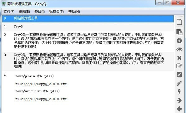 这样一来windows自带的剪贴板功能就显的不够用了,CopyQ则是带有增强型的剪贴板,并且和windows自带的无缝集成,CopyQ激 活这个功能时,当你按下ctrl+c,选中的内容也会同时存储到增强型的剪贴板中,所以你无需为了使用CopyQ改变复制的习惯。