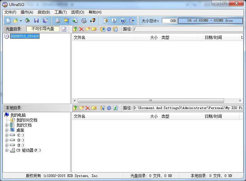 方法:新建ISO文件,将文件或目录从界面下方的“本地”浏览器拖放到上方的“光盘”浏览器,最后保存就可以了。
