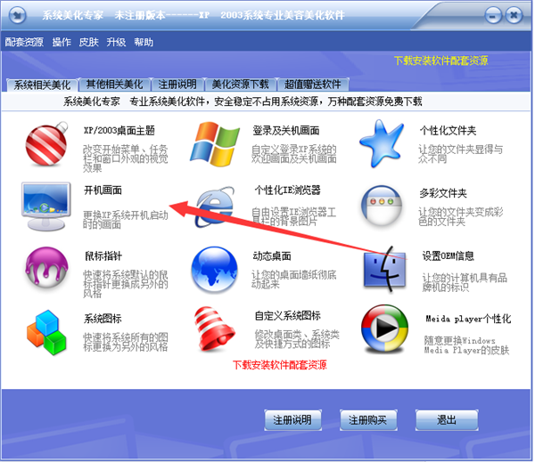 2、在“系统美化专家”的主界面上点击‘开机画面’文字或图标,将出现‘开机画面’设置的面板。