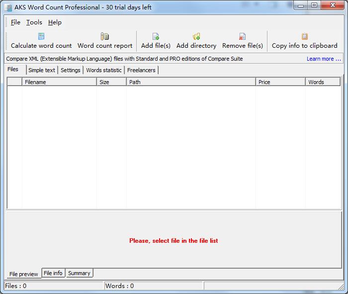 AKS Word Count是一款可以帮助用户统计各种电子文档字数的软件,软件支持计算PDF,Word,Excel,HTML,Open Office,PowerPoint,RTF中的单词,字符和段落。