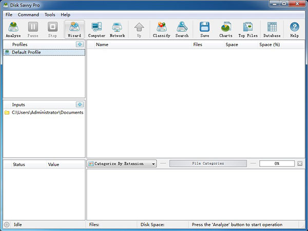 disk savvy pro免费版是功能强大的磁盘空间使用分析器,用户具有分析一个或多个磁盘,目录或网络共享,使用大量磁盘空间检测目录和文件,生成各种类型的饼图,保存磁盘空间使用情况报告以及执行磁盘空间使用情况历史趋势的能力。分析操作。可以查看图像占用多少百分比,可以了解zip占用多少百分比,了解exe占用多少空间,显示可视化的分析结果,清晰了解各类文件占用情况。